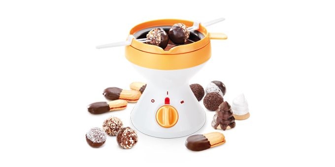 Vynikající pomocník do kuchyně nalezne spoustu využití. Samozřejmě jej využijete při různých oslavách, akcích, dětských oslavách ale i jen tak, když dostanete chuť na něco sladkého. Příprava čokoládového fondue je s ním jednoduchá a rychlá. Vždy používejte kvalitní tmavou hořkou, mléčnou nebo bílou čokoládu s vysokým obsahem kakaového másla, jedině tak dosáhnete opravdového požitku. Fondue využijete také při přípravě čokolády pro zdobení moučníků nebo pro tvorbu čokoládek ve formičkách. Tescoma Delícia Čokoládové fondue je elektrické a je napájeno ze sítě 230 V, má dva stupně zahřívání. Druhý stupeň slouží pro rychlé rozpuštění čokolády, první pro její uchování v rozpuštěném stavu. Součástí balení je 6 ks fondue vidliček, které jsou opatřeny výliskem, takže je lze jednoduše odložit na okraj misky. Miska na čokoládu je opatřena rukojetí s nálevkou a je odnímatelná. Miska je dodávána s víčkem pro možnost uchování misky s nespotřebovanou čokoládou v lednici. Při čištění je nutné přístroj vždy odpojit ze sítě a nechat ohřívač vychladnout. Základnu přístroje čistěte vlhkou utěrkou a ihned osušte, nikdy ji nemyjte pod tekoucí vodou nebo v myčce. Víčko, miska, rukojeť i vidličky jsou vhodné do myčky.
