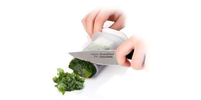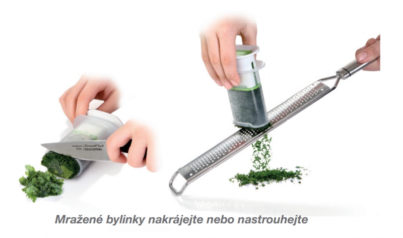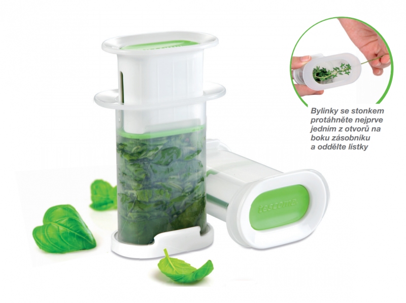 Chcete-li mít vždy po ruce bylinky a nemáte stálý přístup k těm čerstvým, pak je právě pro Vás určen skvělý lis na mražené bylinky od Tescomy. Pomůže Vám uchovat úrodu bylinek až do příští sklizně. Tescoma Handy Lis na mražené bylinky je určen pro přípravu, skladování a také snadné použití zmražených bylinek. Díky lisu slisujete bylinky snadno slisujete. Ideální pro bylinky jako je bazalka, majoránka, meduňka, pažitka, petržel, tymián, kopr, šalvěj, koriandr apod. Úžasnou vlastností lisu je, že bylinky jde odebírat postupně dle potřebného množství a zbytek zase zpátky vložit do mrazáku pro příští použití. Stačí vyjmutý lis z mrazničky opláchnout vlažnou vodou, sejmout víčko, zatlačit na bílý okraj pěchovadla a vysunout požadované množství bylinek, které odeberete nožem, nebo nastrouháte na struhadle. Poté nasadíte víčko zpátky a vložíte lis zpátky do mrazničky. Píst lisu je navíc teleskopický, takže je skvěle skladný a po naplnění nevyčnívá ven. Píst umožňuje úplné vytlačení bylinek ze zásobníku. Skvělou vychytávkou jsou otvory pro rychlé oddělování lístků bylinek od stonků, které jsou umístěny pod horním okrajem zásobníku. Navíc má na bocích plochu s matným povrchem pro popis skladovaných bylinek tužkou či omyvatelnou fixou, což poslouží ke skvělé přehlednosti potravin ve vašem mrazáku. Vhodné do myčky nádobí.
