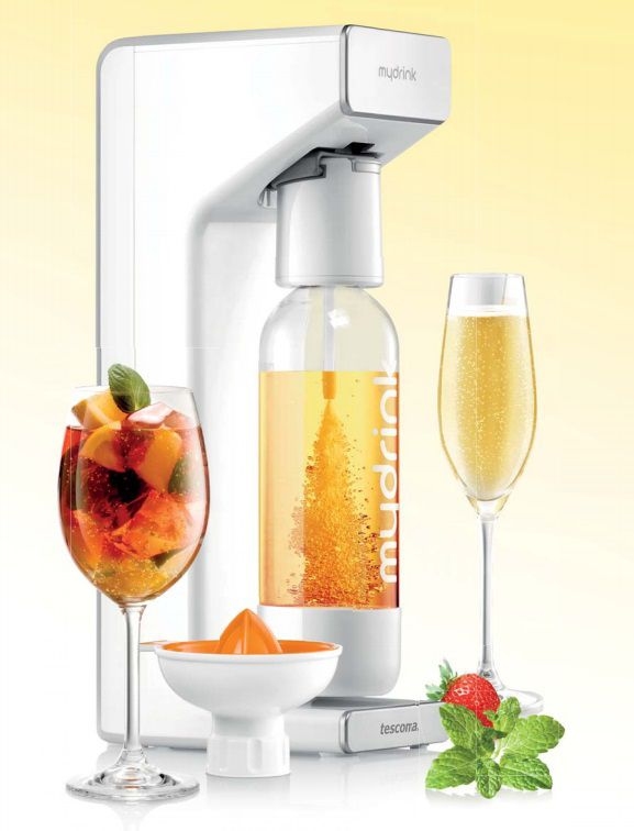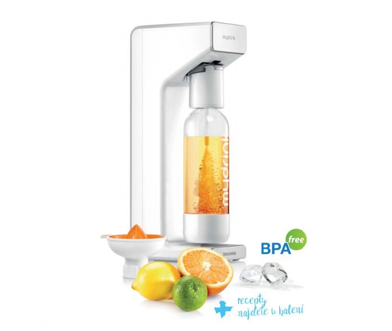 S tímto inovativním výrobníkem sycených nápojů kromě klasické čerstvé sody připravíte také sycené nápoje z čerstvě vymačkaných citrusů, domácí zeleninové nápoje a domácí limonády. Ale to není vše, s výrobníkem si připravíte domací vinný střik, šumivý sekt či osvěžující long drinky (Gin Fizz, Hugo apod.). Každý nápoj bude vždy dokonale promíchán s bublinkami, bude mít přirozeně intenzivní chuť a můžete jej ihned podávat. Tescoma MyDrink Výrobník sycených nápojů, klíčové vlastnosti: jednoduchý, elegantní a moderní design výrazná úspora nákladů oproti baleným vodám a limonádám ochrana životního prostředí - pro výrobu sodovky postačí pouze jedna láhev součástí výrobníku je uzavíratelná plastová láhev o objemu 1 l, která neobsahuje škodlivý uhlovodík BPA (není vhodná do myčky nádobí) láhev lze skladovat v chladničce unikátní uzávěr láhve se 2 odvzdušňovacími ventily (modrý pro rychlé odvzdušnění sody, která po otevření ventilu nepění a šedý ventil pro pomalé a kontrolované odvzdušnění všech ostatních ochucených nápojů) unikátní odšťavňovač s nálevkou vyroben z prvotřídních hygienicky prověřených materiálů s bombičkou lze připravit až 85 l šumivého nápoje součástí balení je přístroj, 1 láhev, 1 bombička, odšťavňovač s nálevkou, recepty na osvěžující drinky Prázdnou bombičku MyDrink je možné za plnou vyměnit pouze v naší kamenné prodejně v Příbrami nebo jiných prodejních centrech Tescoma.
