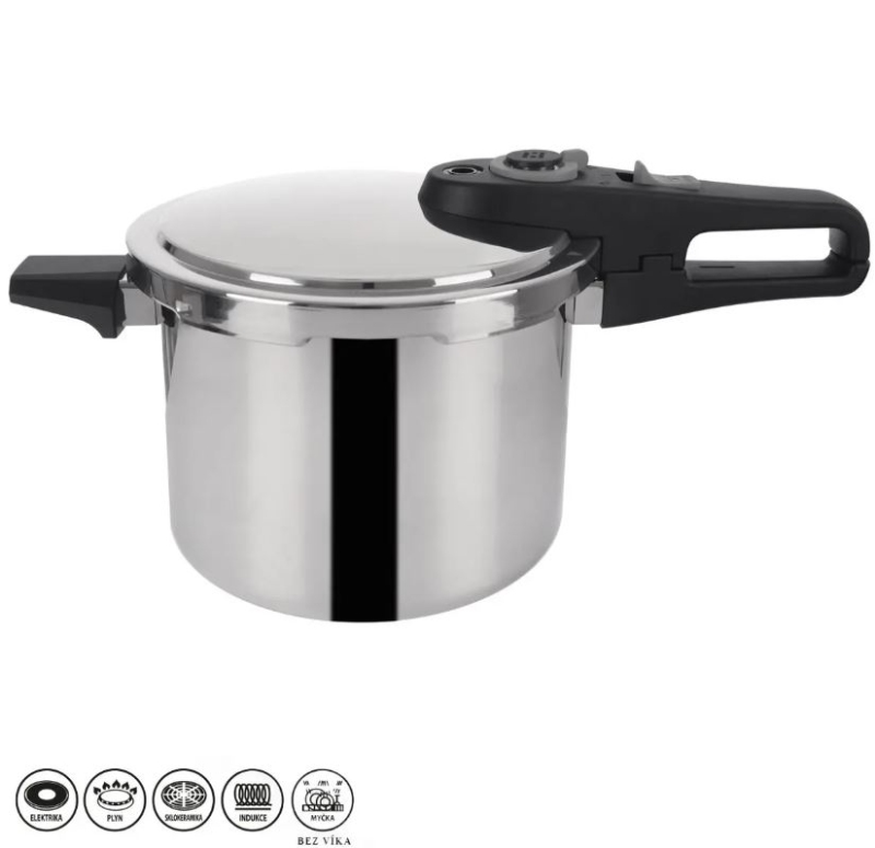 Nabízí komfortní obsluhu – hrnec otevřete/zavřete zcela snadno a bez potřeby síly. Je vyroben z nerezové oceli, dá se s ním vařit na všech vařičích, včetně indukce a je vhodný do myčky (bez víka). Je opatřen sendvičovým dnem – tepelný zdroj vypínáme s předstihem, naakumulovaná energie předává teplo dále do nádoby. Velmi jednoduchý systém otvírání a zavírání. Hrnec je opatřen pracovním ventilem s možností nastavení intenzity upouštění páry - 2 programy pro vaření + jedna poloha ventilu k upuštění páry. Je nutné plnit hrnec vždy pouze do označené výšky hladiny MAX (4 l, vnitřní strana hrnce). Materiál: nerezová ocel třídy 304 s/s, dno: hliník (uvnitř dna) + nerezová ocel 430 s/s, plast na víku: PA6(polyamid 6), plast rukojeti: bakelit, těsnění: silikon. Rozměry: objem 6 l, vnitřní pr. 22 cm, vnější pr. 24 cm, v. 16,5/21 cm, š. s uchy 45 cm. Náhradní těsnění z naší nabídky 180820. Skleněné poklice k tomuto hrnci z naší nabídky 126330. Součástí balení je návod na obsluhu.