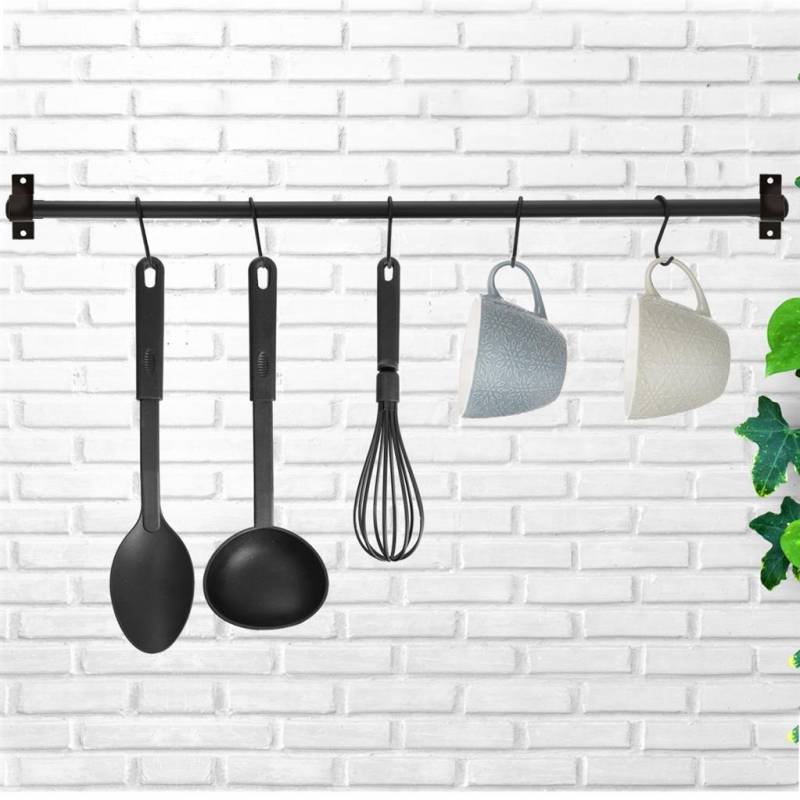 Závěsná tyč s háčky na odkládání kuchyňského náčiní, které na tyč zavěsíte a máte je tak neustále po ruce. Součástí 5 háčků i montážní materiál. Materiál: hliník s černým nástřikem. Rozměry: celková délka 78,5 cm, pr. tyče 1,8 cm. Náhradní háčky v naší nabídce 834724.| Výrobce: | Orion |