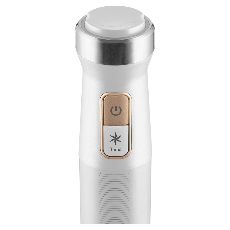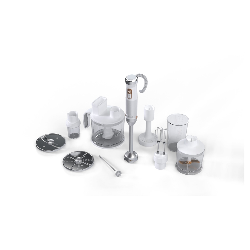Výjimečně vybavený tyčový mixér Sencor SHB 6551WH se stane Vaším nepostradatelným parťákem v kuchyni. Rozmělní, nastrouhá, naseká, našlehá, rozdrtí, rozmixuje, napění i připraví dokonale hladkou bramborovou kaši. S jeho pomocí zvládnete každý recept a i příprava teplých jídel bude hračka. Je opatřen velice výkonným motorem 1 500 W a nerezovými součástmi. Díky ergonomicky tvarované rukojeti a flexibilní koncovce přívodního kabelu o 360° je snadno ovladatelný a výborně se s ním manipuluje. Hlavní parametry produktu: výkonný ruční tyčový mixér 1 500 W, otočný regulátor rychlosti, turbo tlačítko, ergonomicky tvarovaná rukojeť, technologie Titanum QuadBlade pro zachování vitamínů a minerálů, nerezové příslušenství, nerezový mixér o délce 20 cm, bezpečnostní zámek, bohatá výbava. Obsah balení: dvojitý ruční šlehač z nerezové oceli, mačkač brambor, nerezový mixér o délce 20 cm, kuchyňský robot s 2 noži z nerezové oceli a nádobou o objemu 1,5 l, mlýnek na koření a bylinky, strouhací a krájecí nástavec, napěňovač mléka, sekací nástavec s nádobou o objemu 500 ml, odměrná nádoba s víkem 800 ml.