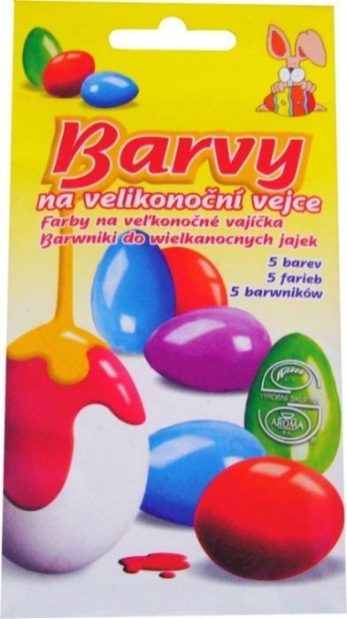 5 práškových barev určené na barvení velikonočních vajec. Snadná a rychlá aplikace, výrazné barvy. Návod použití: Obsah jednotlivých sáčku rozpusťte v 1/3 litru horké vody (cca 70°C) s 2 - 3 lžícemi octa a vložte čistá, odmaštěná a natvrdo uvařená vajíčka na 2 - 5 min. Obarvená vajíčka vyjměte a nechte oschnout. Pro sytější odstíny barev použijte menší množství vody. Mícháním jednotlivých barev docílíte různých odstínů. K docílení lesku vajíčka potřete tukem.