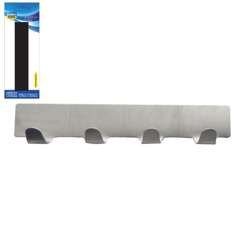 Věšák se 4 háčky využijete kdekoli v domácnosti. Nemusíte vrtat do zdi, jednoduše přilepíte na očištětný a odmaštěný hladký povrch pomocí samolepky na věšáku. Materiál: nerez. Rozměry: 16x3x2 cm.| Výrobce: | Orion |