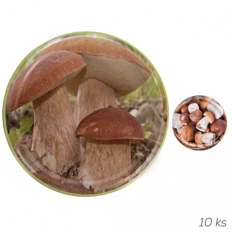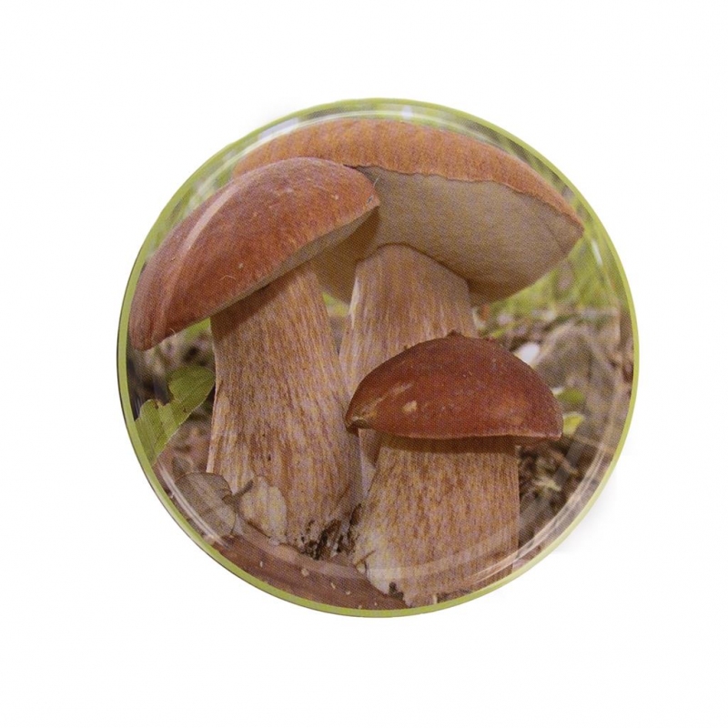 Víčko na zavařovací sklenici, se závitem. Materiál: kov. Dekor houby. Rozměry: pr. 8,5 cm.| Výrobce: | Orion |
